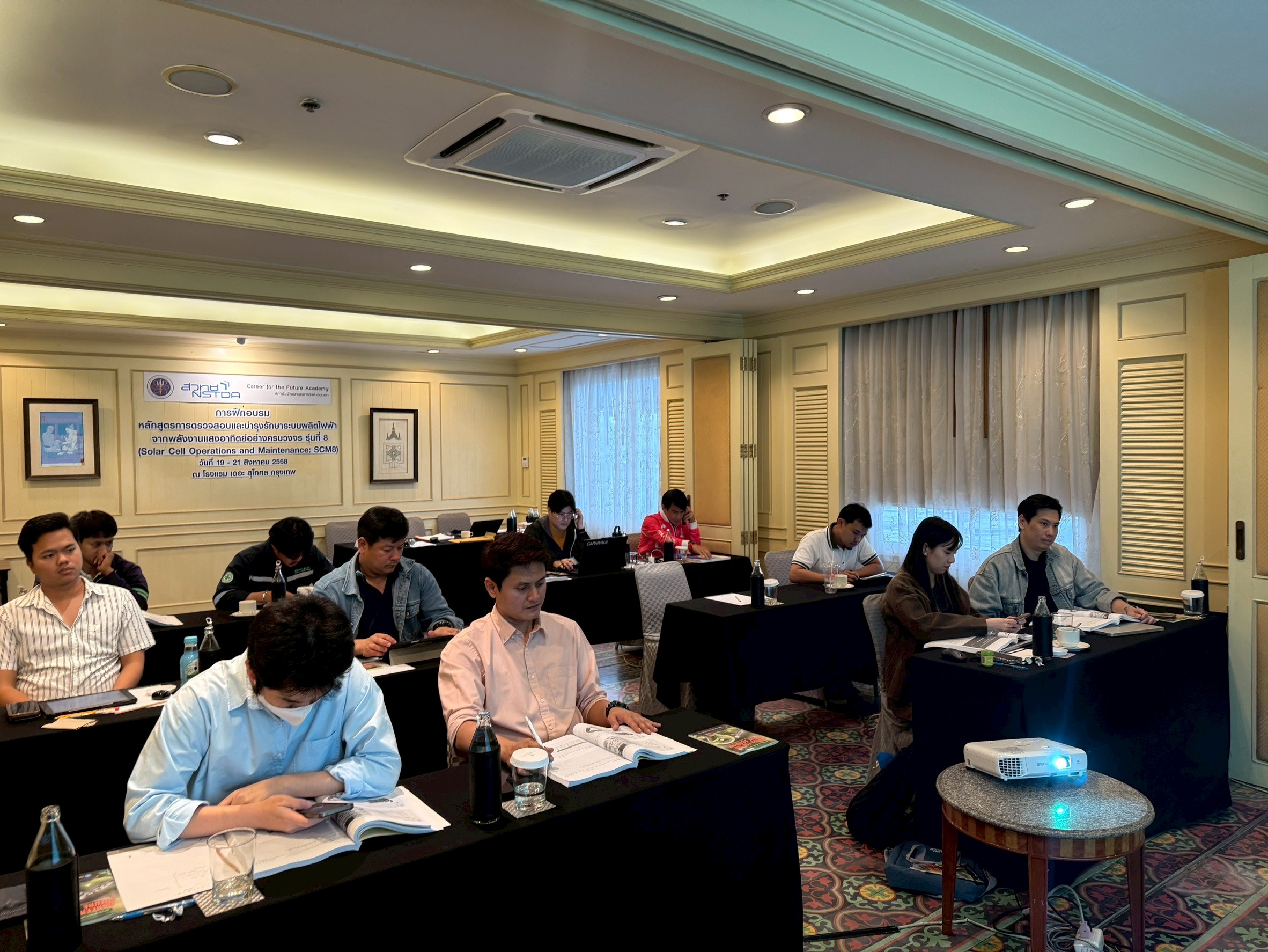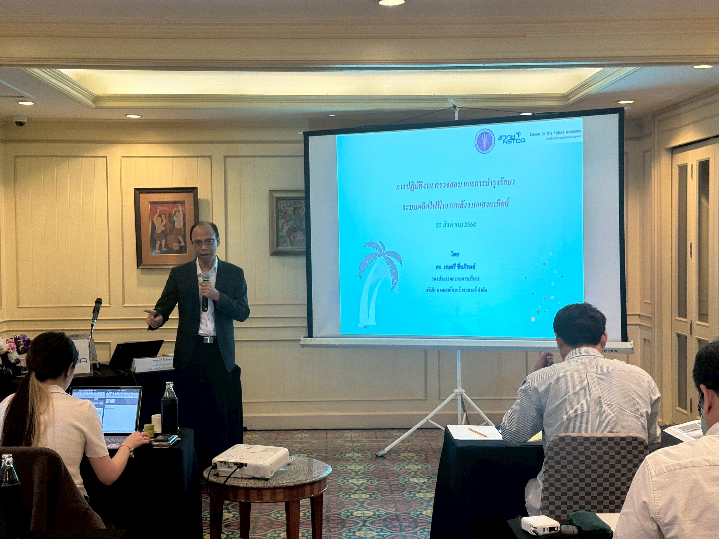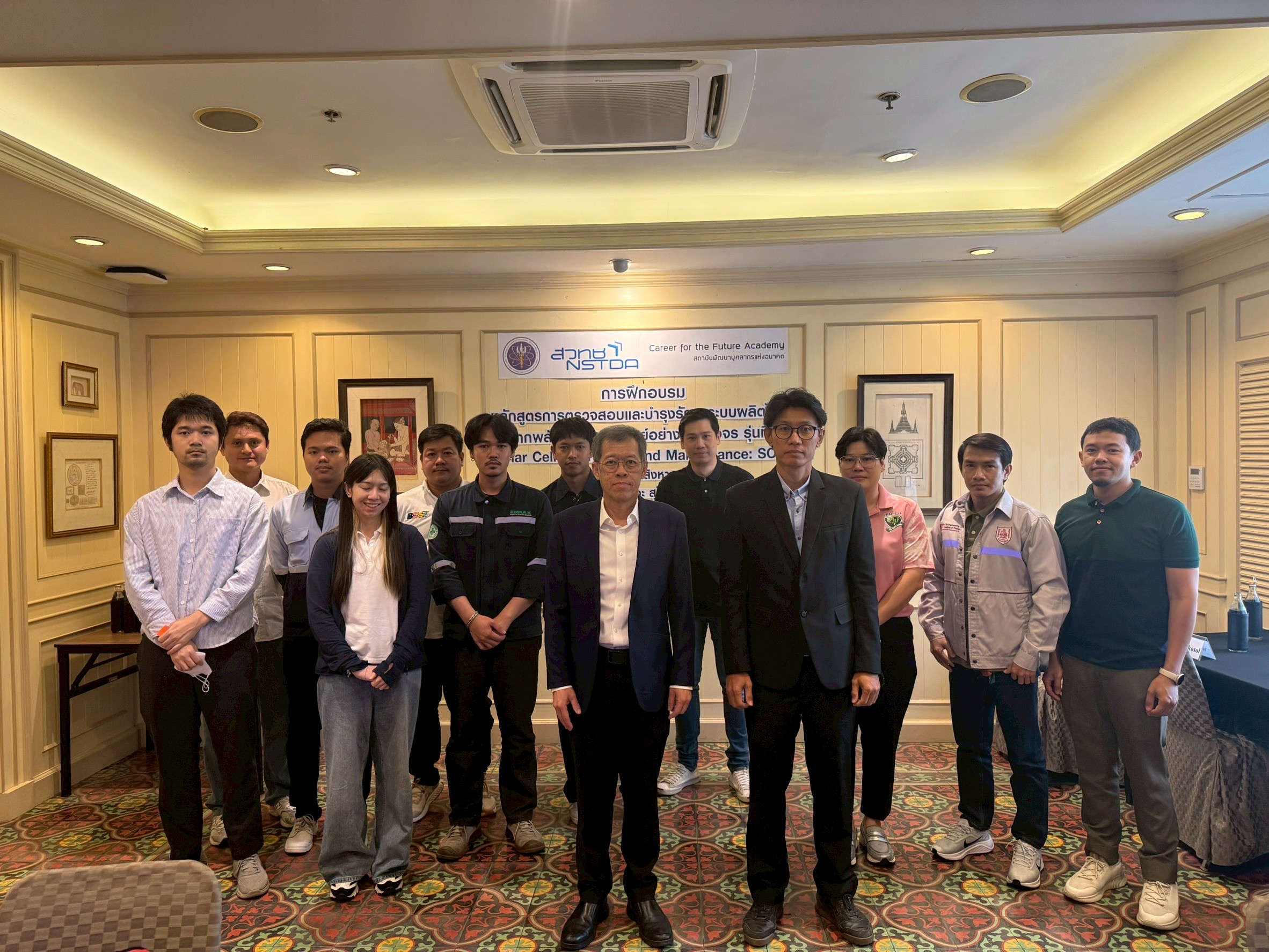 เมื่อวันที่ 19 – 22 สิงหาคม 2568 ที่ผ่านมา สถาบันพัฒนาบุคลากรแห่งอนาคต (Career for the Future Academy: CFA) ได้จัดฝึกอบรม หลักสูตรการตรวจสอบและบำรุงรักษาระบบผลิตไฟฟ้าจากพลังงานแสงอาทิตย์อย่างครบวงจร (Solar Cell Operations and Maintenance) รุ่นที่ 8 ณ โรงแรมสุโกศล กรุงเทพ ซึ่งในการฝึกอบรมครั้งนี้มีผู้เข้าร่วมอบรมจากหน่วยงานภาครัฐและภาคเอกชนรวมจำนวนทั้งสิ้น 11 ท่าน