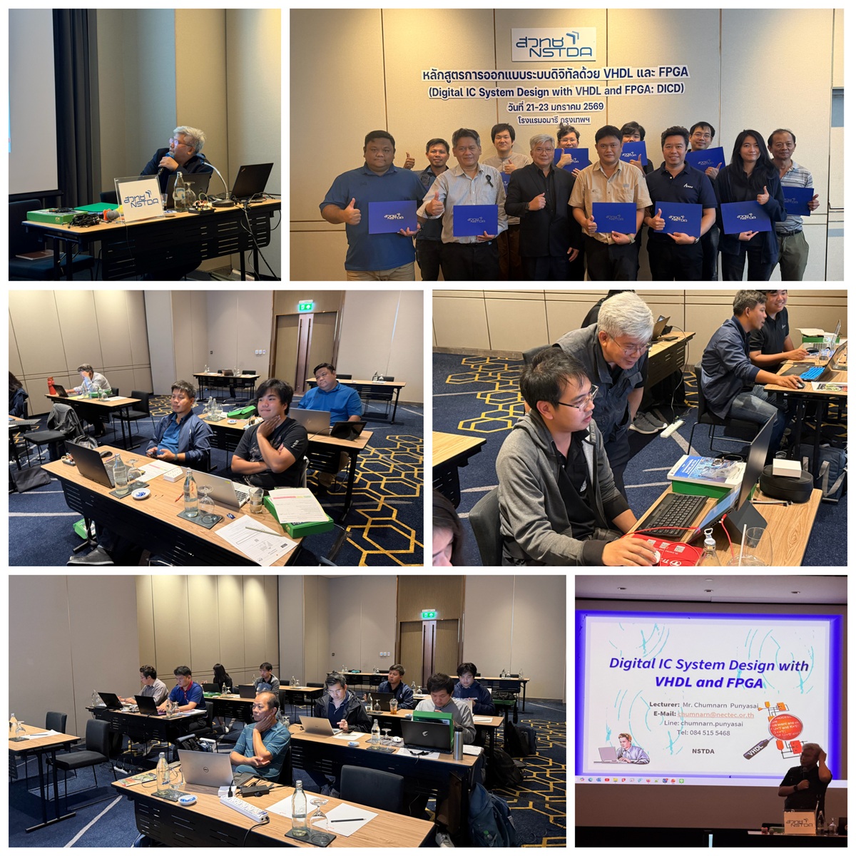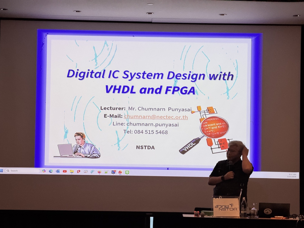 สถาบันพัฒนาบุคลากรแห่งอนาคต ได้เปิดการฝึกอบรมหลักสูตรการออกแบบระบบดิจิทัลด้วย VHDL และ FPGA (Digital IC System Design with VHDL and FPGA: DICD) ระหว่างวันที่ 21-23 มกราคม 256ต ณ โรงแรมเซ็นจูรี่ พาร์ค กรุงเทพ โดยได้รับเกียรติจาก คุณชำนาญ ปัญญาใส นักวิจัย ศูนย์เทคโนโลยีอิเล็กทรอนิกส์และคอมพิวเตอร์แห่งชาติ ซึ่งเป็นผู้เชี่ยวชาญด้านการออกแบบระบบดิจิทัลด้วย VHDL และ FPGA มาเป็นวิทยากรในครั้งนี้ การอบรมนี้ มีผู้เข้าร่วมอบรมจากหน่วยงานภาครัฐและเอกชน รวมจำนวนทั้งสิ้น 11 ท่าน