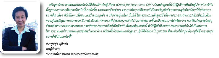 หลักสูตรวิทยาศาสตร์และเทคโนโลยีสีเขียวสำหรับผู้บริหาร (Green for Executives: G4X – Paving the Way for Greener Economy) จะนำท่านสู่การเป็น “ผู้นำการเปลี่ยนแปลง” ที่มีวิสัยทัศน์ มีสมรรถนะ และขีดความสามารถสูงในการขับเคลื่อนองค์กรด้วยวิทยาศาสตร์และเทคโนโลยีสีเขียว (Green Initiatives) สู่การเป็นองค์กรสีเขียว (Green Enterprise) และสังคมคาร์บอนต่ำ (Low-Carbon Society) ด้วยหลักการและกรณีศึกษาที่เป็นเลิศ (Best Practices) เน้นการแบ่งปัน การแลกเปลี่ยนเรียนรู้จากนักบริหาร ผู้กำหนดนโยบาย ผู้เชี่ยวชาญ นักปฏิบัติ ที่มีประสบการณ์ตรงด้านการนำองค์กรสู่การเป็นองค์กรสีเขียวด้วยวิทยาศาสตร์และเทคโนโลยีสีเขียว