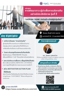 | หลักสูตรการพัฒนาภาวะผู้นำเพื่อการบริหารทีมอย่างมีประสิทธิภาพ “INSPIRE TEAM: นำด้วยใจ สไตล์ผู้นำรุ่นใหม่” (Modern Leadership Development for Effective Team Management: MLD) |