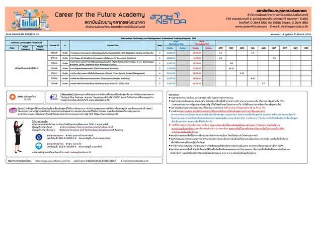 Career for the Future Academy ออกแบบและพัฒนากลุ่มหลักสูตรเทคโนโลยีสารสนเทศและการจัดการขั้นสูง เพื่อเติมเต็มความรู้และประสบการณ์ด้านวิทยาศาสตร์และเทคโนโลยีสารสนเทศ ตลอดจนองค์ความรู้ด้านวิทยาศาสตร์และเทคโนโลยีสารสนเทศที่เป็นประโยชน์ต่อการบริหารจัดการขั้นสูงขององค์กร โดยเนื้อหาหลักสูตรผสมผสานทั้งภาคทฤษฎี การประชุมเชิงปฏิบัติการ การฝึกปฏิบัติ การทำโจทย์ปัญหา/กรณีศึกษาจริง และการศึกษาดูงานแนวปฎิบัติที่เป็นเลิศจากหน่วยงานชั้นนำทั้งในและต่างประเทศ เพื่อเรียนรู้หลักการ แลกเปลี่ยนความรู้ประสบการณ์จากผู้เชี่ยวชาญและเครือข่ายผู้เข้าอบรม ตลอดจนศึกษาประสบการณ์ แนวปฏิบัติทั้งที่สำเร็จและล้มเหลวของหน่วยงานชั้นนำเพื่อนำไปปรับใช้ในองค์กรได้อย่างมีประสิทธิภาพสูงสุด