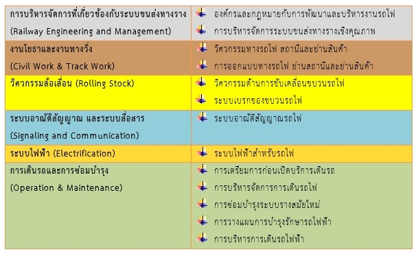 - เป็นหลักสูตรที่ให้ความรู้ด้านวิศวกรรมระบบขนส่งทางรางอย่างครบทุกแง่มุม ทั้งด้านนโยบาย เทคนิค และการบริหารจัดการ
