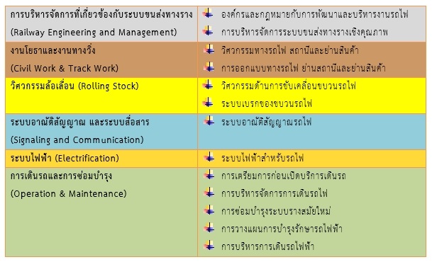 - เป็นหลักสูตรที่ให้ความรู้ด้านวิศวกรรมระบบขนส่งทางรางอย่างครบทุกแง่มุม ทั้งด้านนโยบาย เทคนิค และการบริหารจัดการ