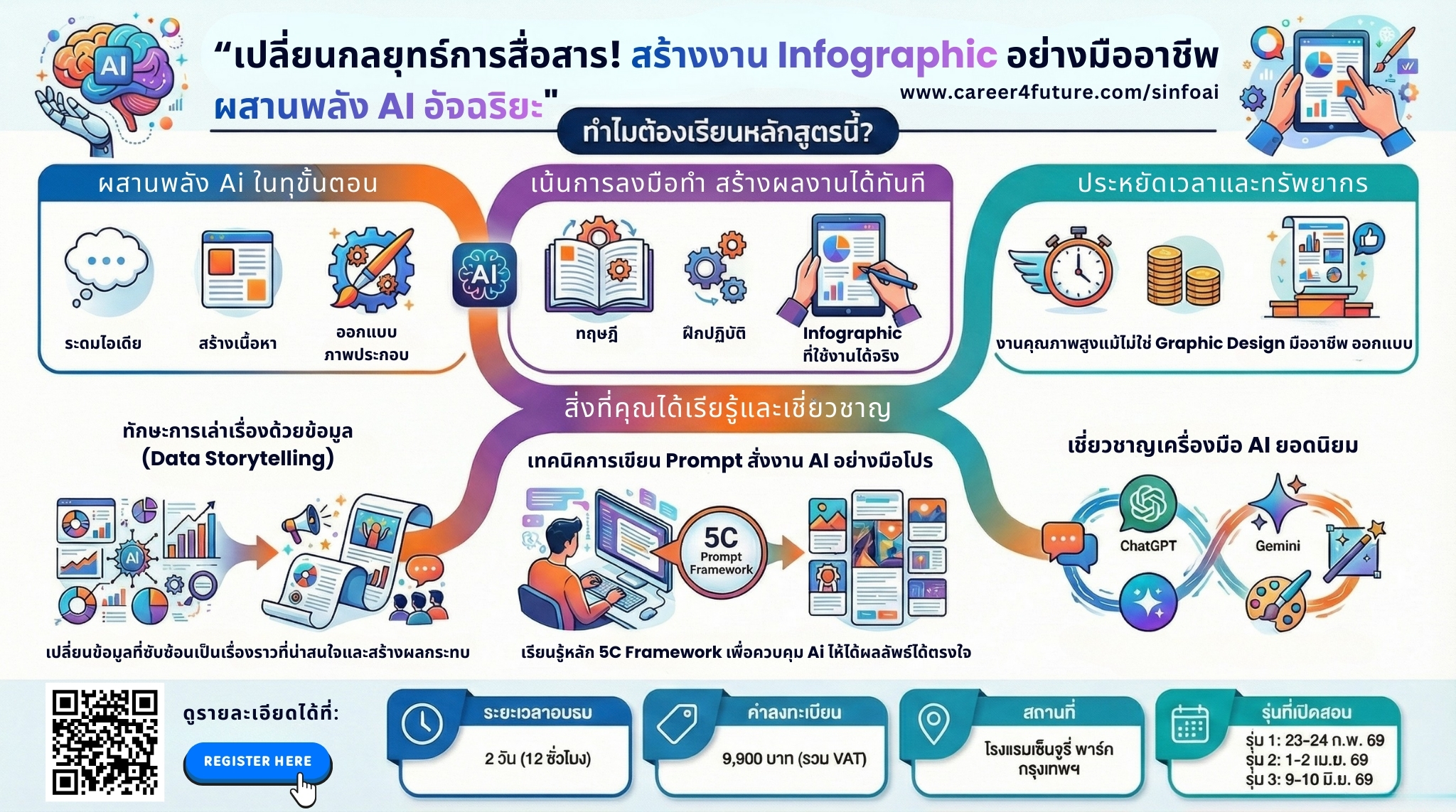 หลักสูตรนี้จึงถูกออกแบบมาเพื่อตอบโจทย์ความท้าทายนี้ ด้วยการให้ความรู้ความเข้าใจอย่างลึกซึ้งในหลักการสร้างสรรค์ Infographic ควบคู่ไปกับการใช้ ปัญญาประดิษฐ์ (AI) เป็นเครื่องมือช่วยเสริมศักยภาพในทุกขั้นตอน ไม่ว่าจะเป็นการวิเคราะห์ข้อมูล การสร้างสรรค์แนวคิด การออกแบบ และการปรับปรุงเนื้อหา ทำให้ผู้เข้าร่วมอบรมสามารถสร้างงานสื่อสารระดับมืออาชีพได้อย่างรวดเร็ว แม่นยำ และประหยัดต้นทุน